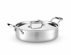 Hammer Stahl’s cookware is made through ingenious 5-ply construction. There are five layers of different metals in each piece of cookware that work together to spread the heat evenly and efficiently. These five layers are not just used for the base of the cookware, but the sides as well. This means the aluminum core will spread heat throughout the walls as well as the base, allowing the heat to spread more evenly and make the cookware less likely to burn.