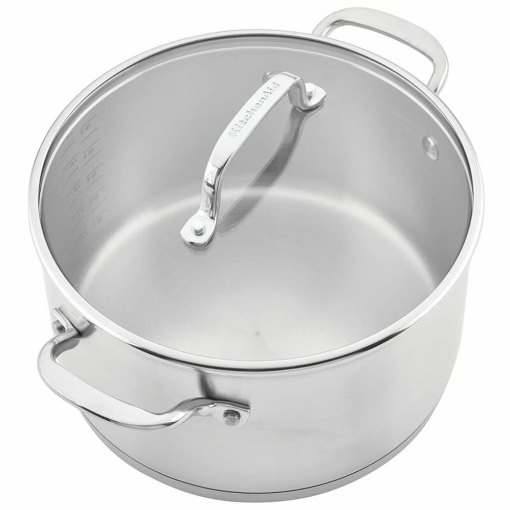 Constructed from high-quality 18/10 stainless steel, the 3-Ply Base 11-Piece Cookware Set from KitchenAid has a thick layer of heat-conducting aluminum sandwiched between two layers of stainless steel in the base for excellent edge-to-edge heat conductivity. Quickly sear meat, sauté vegetables, and reduce sauces on your way to making delicous meals on any stovetop, including induction. Volume measurements etched inside the saucepans and stockpot make it easy to measure ingredients, while all the pans and tempered-glass lids are dishwasher-safe to simplify cleanup and care. The lids for the two saucepans have built-in strainer rims so you can easily strain off liquid without the need for a standalone strainer. The cookware is oven-safe to 500ºF without the lids (350ºF with lids) making this 11-Piece Cookware Set as versatile as it is durable for everyday kitchen use.