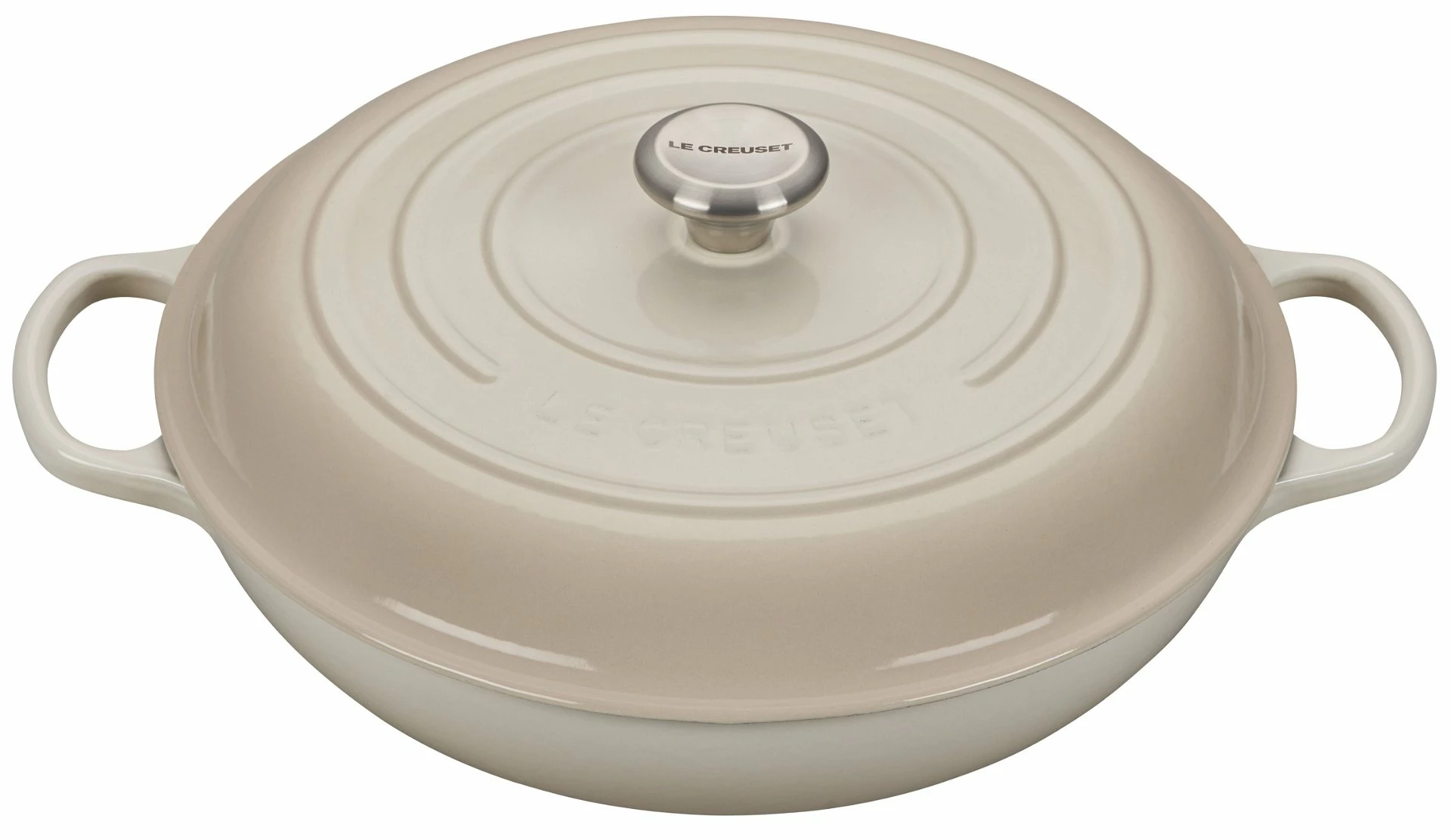 The family will rush to the table for a hearty meal braised and browned in Le Creuset’s 5-Quart Signature Braiser in Meringue. With a dome-shaped lid that locks in flavor by promoting the continuous circulation of heat and moisture and Le Creuset’s signature enameled-coated cast iron, this braiser brings the performance you need to turn out mouth-watering braised meats and vegetables.
