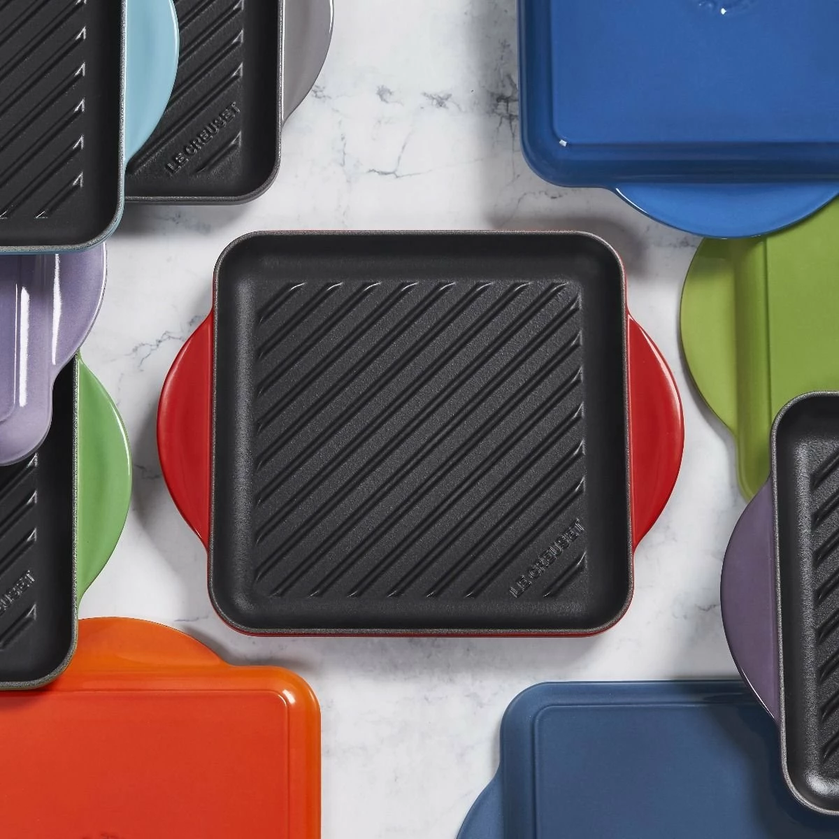Le Creuset 9.5″ Square Signature Enameled Cast Iron Grill Pan (Cerise/Cherry Red) Features: