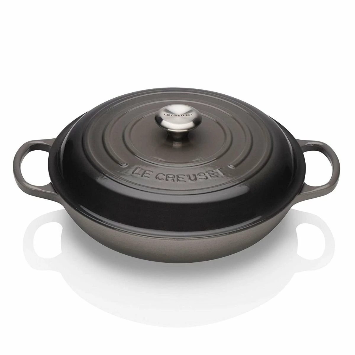 - Le Creuset 2.25 Qt. Signature Enameled Cast Iron Braiser with Stainless Steel Knob | Oyster Grey – Transform even the toughest cuts of meat into tender, juicy dishes with the Le Creuset 2.25-Quart Signature Braiser in captivating Oyster! Known in France as the “everyday pot,” this unique cooking vessel is a fan favorite for its wide range of versatility. With a flat base and tall, curved sides, the Signature Braiser is perfect for searing, roasting, stir-frying, slow-cooking, simmering, braising, baking, and more! With the Signature Braiser, there’s no culinary endeavor you can’t take on. Made of Le Creuset’s time-honored enameled cast iron that provides superior heat retention and even heat distribution to prevent hot and cold spots, this 2.25-Quart Braiser includes a tight-fitting lid with a redesigned stainless steel knob that’s oven-safe up to 500°F.