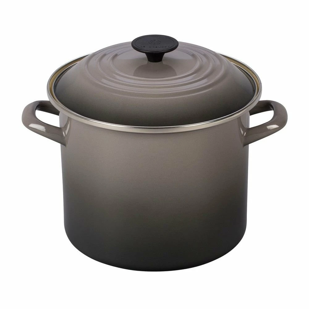- Le Creuset 8 Qt. Stock Pot | Oyster Grey – Make complex stocks, hearty soups & stews, or a spicy Cajun crawfish boil to bring friends & family together in the Le Creuset enameled 8 Quart Stock Pot. The design of this Le Creuset stockpot limits evaporation causing liquids to mix and bubble together giving your entire dish rich flavor. Safe to use on any heat source from electric to halogen. The stainless steel rim helps to prevent cracking or chipping of the sleek porcelain enamel. Follow simple care instructions to ensure the enjoyment of your Le Creuset 8 qt stockpot for years to come.