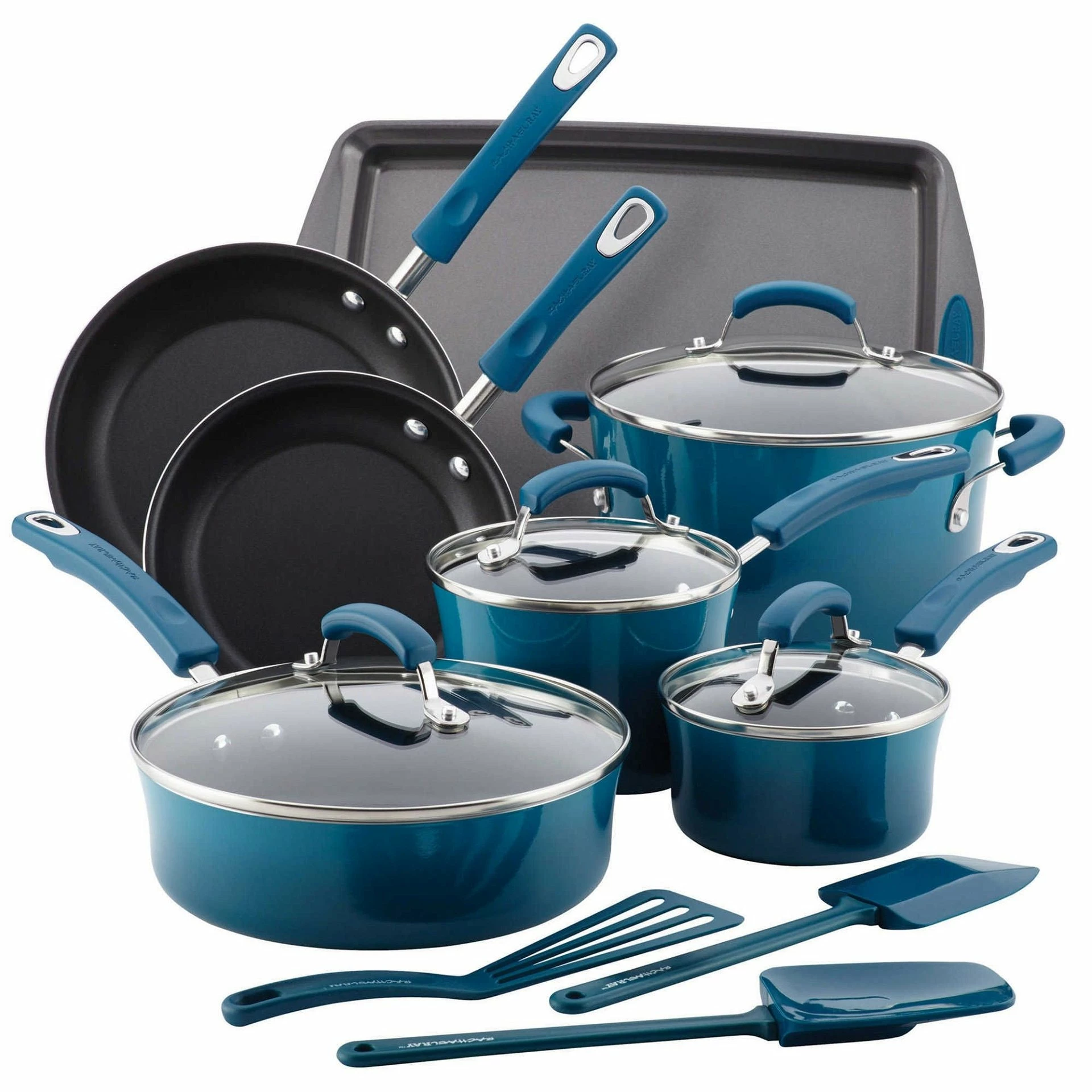 Kick off your cooking in style. The Rachael Ray Marine Blue Cookware Set is a fantastic addition to your kitchen with its functionality and decorative look. This 14 piece set comes with all the essentials needed to prepare breakfast and dinner any day of the week. Provided with the Rachael Ray Enamel Cookware Set are: a 1-quart and 2-quart saucepan with matching lids, a 3 quart sauté pan with matching lid, a 6-quart stockpot with lid, and two skillets; one measuring 8.5-inches and 10-inches. Additional accessories included a large baking sheet to warm dinner rolls or make chocolate chip cookies and 3 utensils to cook with.