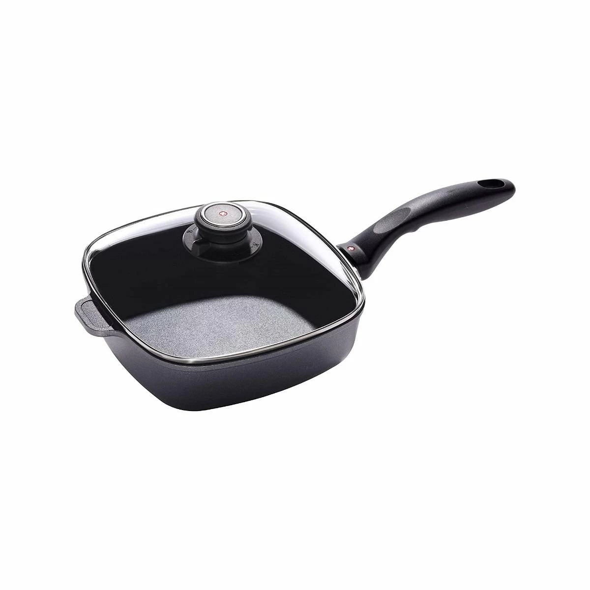 Squared so chicken breasts and strip steaks fit better, but with a rounded bottom that fits the standard stove eye, Swiss Diamond’s HD Nonstick Square Sauté Pan with Lid will quickly become one of your favorite pans! This 8” x 8” square pan has high 2.5” sides, making it perfect for one-pot suppers, cooking down greens, and keeping fat from splattering out of the pan when you’re cooking a Rib-eye. The HD line of Swiss Diamond cookware features our revolutionary HD nonstick coating made of real diamond crystals. Each pan contains up to 200,000 diamond crystals, creating excellent quality cookware that conducts and distributes heat evenly. Nothing conducts heat more efficiently than diamonds. Combined with the extra-thick cast aluminum body, this square sauté pan has amazingly even heat distribution. With this superior heat retention, it sears ingredients as well as stainless steel, but without the messy cleanup. The XD nonstick coating releases so well, you can cook anything without a drop of oil or butter. Add this 8” x 8” pan to your busy kitchen and it will help you live a lighter, healthier lifestyle!