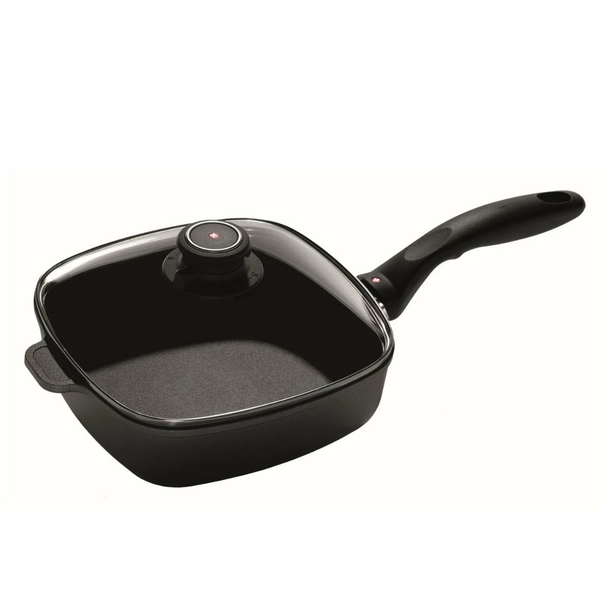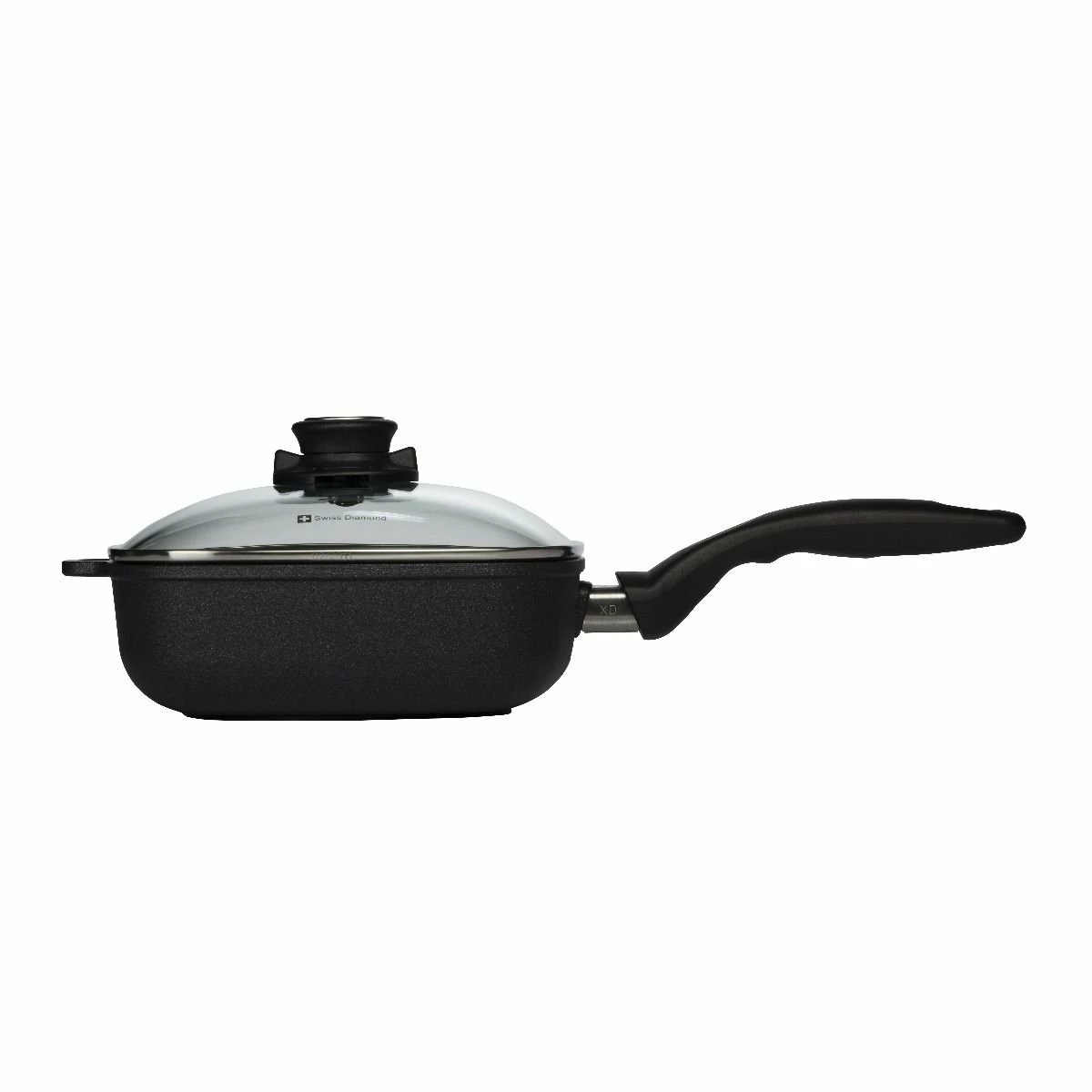 Squared so chicken breasts and strip steaks fit better, but with a rounded bottom that fits the standard stove eye, Swiss Diamond’s XD Nonstick Square Sauté Pan with Lid will quickly become one of your favorite pans! This 8” x 8” square pan has high 2.5” sides, making it perfect for one pot suppers, cooking down greens, and keeping fat from splattering out of the pan when you’re cooking a Rib-eye.