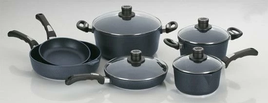 Woll Diamond Plus Induction cookware is made using nano technology to apply diamond-reinforced surfaces that are guaranteed not to blister, crack, bubble, or peel; these surfaces are so durable that they stand up to metal utensils and regular dishwasher cleaning. Each hand-cast aluminum cookware piece in this set is fitted with a metal base for use with induction cooktops, as well as all other gas, electric, ceramic, radiant, and halogen stoves. The Woll 10-Piece Diamond Plus Induction Cookware Set is safe for temperatures up to 500°F.